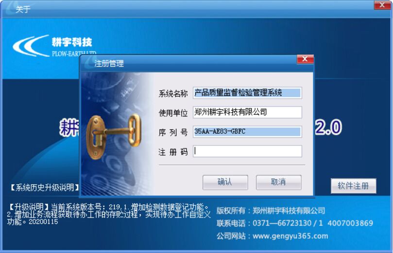 解決方案:我們要用系統管理員的的賬號(sys)進行登錄,然后選擇【幫助】→【關于本系統】,點擊右下角的【注冊】,將序列號發送到耕宇售后的qq上,然后耕宇售后會將注冊碼發送過來,復制粘貼過來,然后點擊確認即可。
